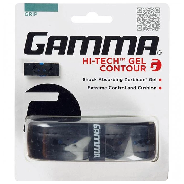 The Gamma HiTech Gel Contour Replacement Grip is a contoured gel grip featuring a firm nonwoven backing and Gammas shock absorbing Zorbicon Gel Your fingers naturally lay between the Gel strips providing exceptional feel and control The palm of your hand rests across the Gel strips offering ultimate shock absorbtionnbsp