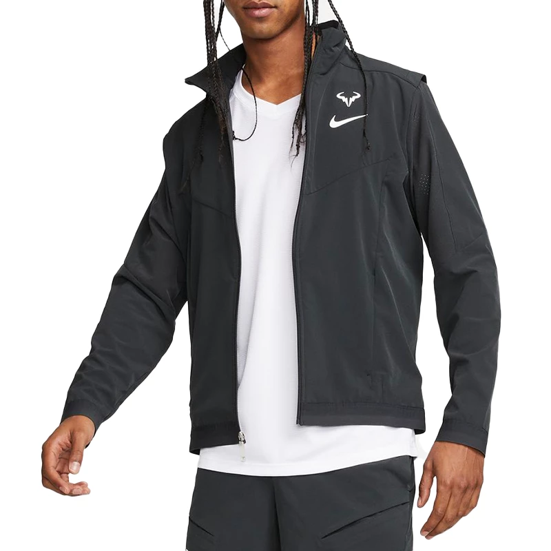 SIGNATURE RAFA STYLEWarmup and cooldown in signature Rafa style The NikeCourt DriFIT Rafa Jacket is a lightweight layer with more than enough stretch to get through your prematch routine Perforations in highheat areas like your back and underarms increase airflow to help you stay cool This product is made with at least 75 recycled polyester fibersNike DriFIT technology moves sweat away from your skin for quicker evaporation helping you stay dry and comfortableVent on the midback gives you extra room to move Perforated fabric under the vent increases airflowElastic at the cuffs and hem helps keep the jacket in place while you movenbsp